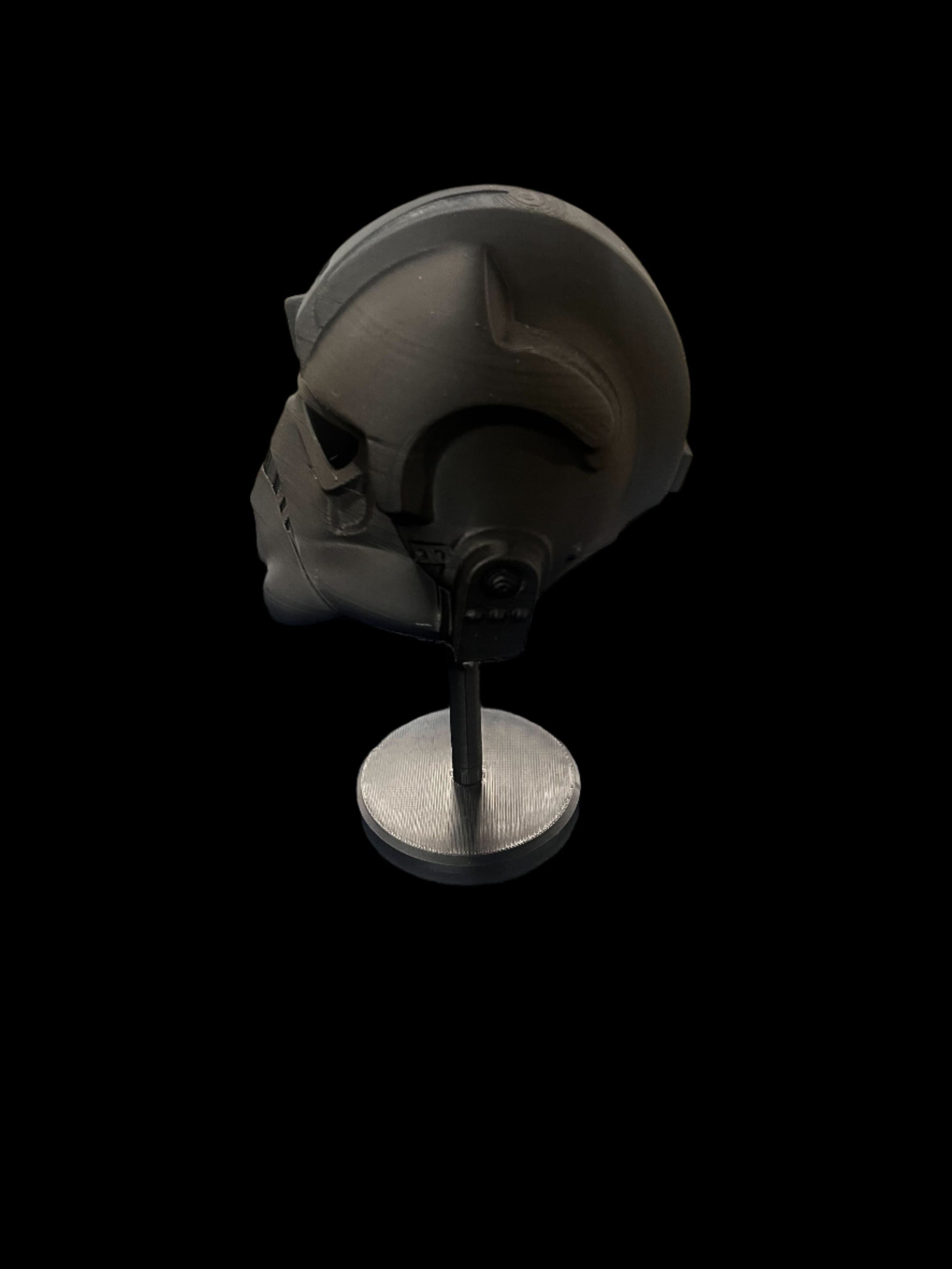 We have printed this helmet in house with our own 3D printing machine. Each helmet comes raw meaning that it comes unfinished, so you can sand and paint it yourself. The helmet comes assembled where possible and a stand is included.