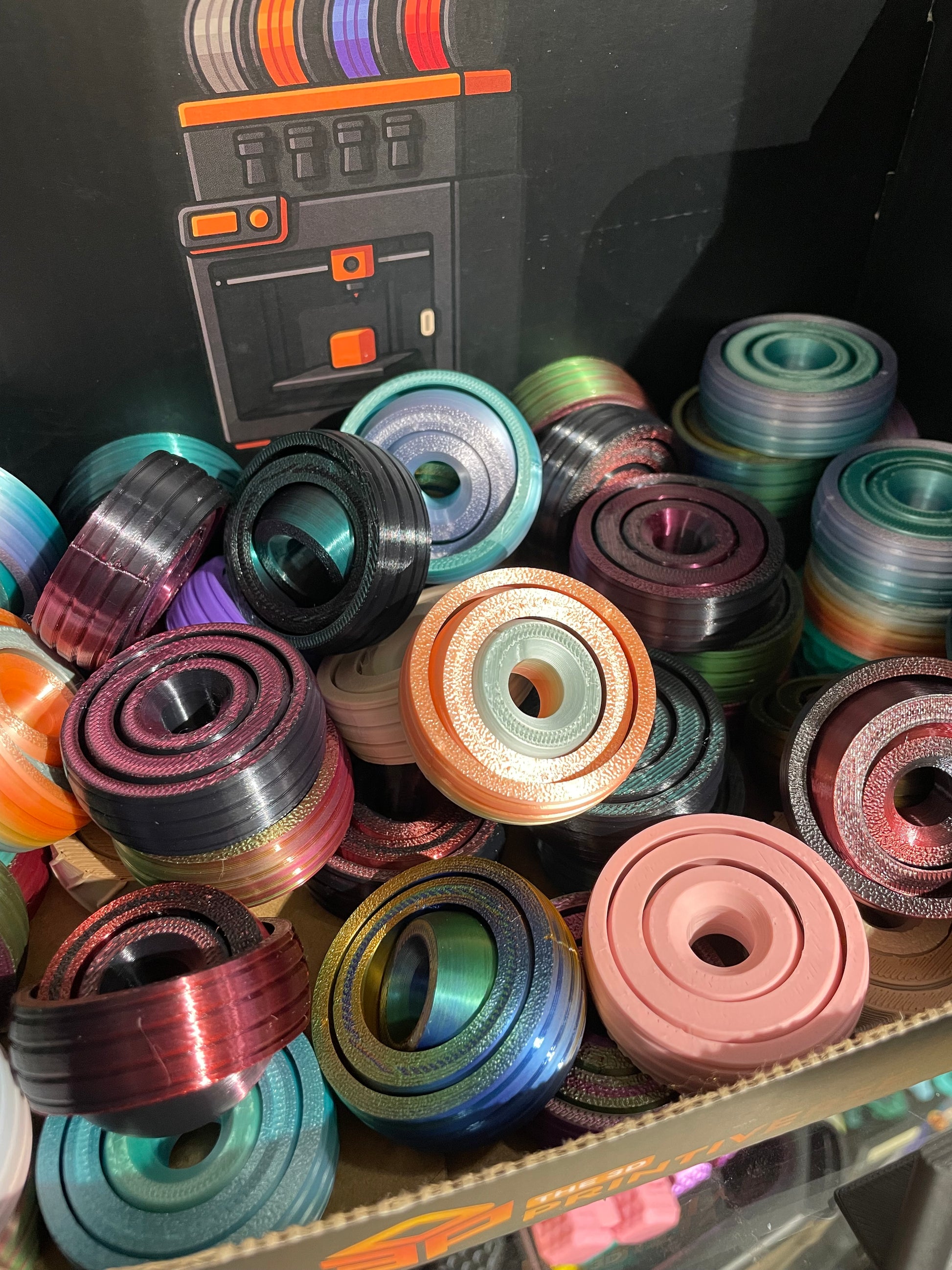 Tyre fidget made of interlocking circles that get smaller as they go inwards. Each ring spins and twists smoothly, giving endless ways to fidget - without ever coming apart.